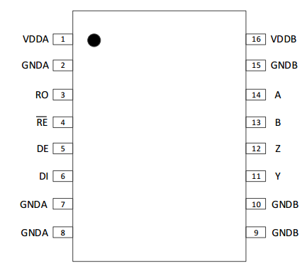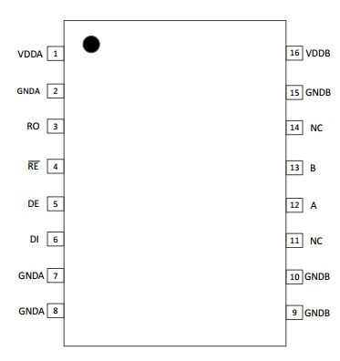 DE 5 邏輯輸入 發送使能端:高電平有效,DE 為低時,發送輸出為高阻。 DE 為高電平時芯片工作在發送狀態,DE 為低電平且RE為低電平時芯片工作在接收狀態